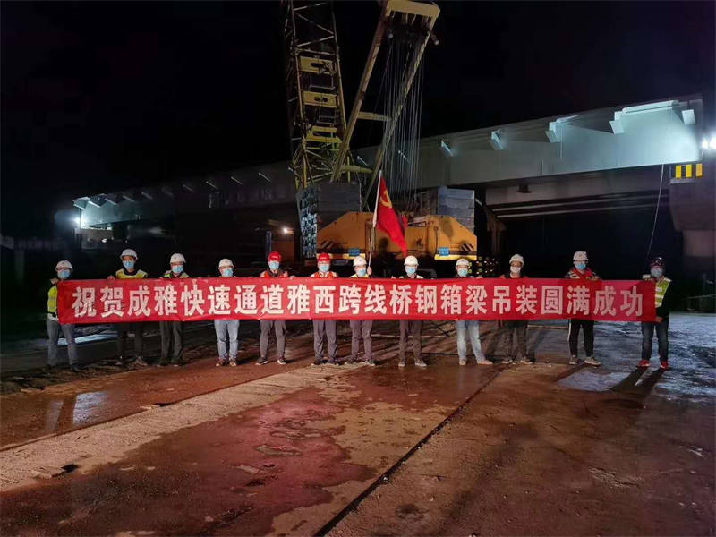 雅西跨線橋是成雅快速通道(雅安段)新建工程重要組成部分,該橋為單跨簡支鋼箱梁橋,全橋設計鋼箱梁4片,單片重量約140噸、長55余米,體積大、自身重、運輸困難,且投入的大型機械設備較多,施工組織難度大。為順利完成架設任務,市交通局會同市交建集團、交建項目管理公司、市公安局交警支隊和各參建單位多次組織召開專題會議,提前謀劃、細致安排、優(yōu)化組織,制定了施工專項方案和應急措施,使整個施工過程按照標準化、程序化、規(guī)范化進行施工,為鋼箱梁的成功吊裝奠定了堅實的基礎。