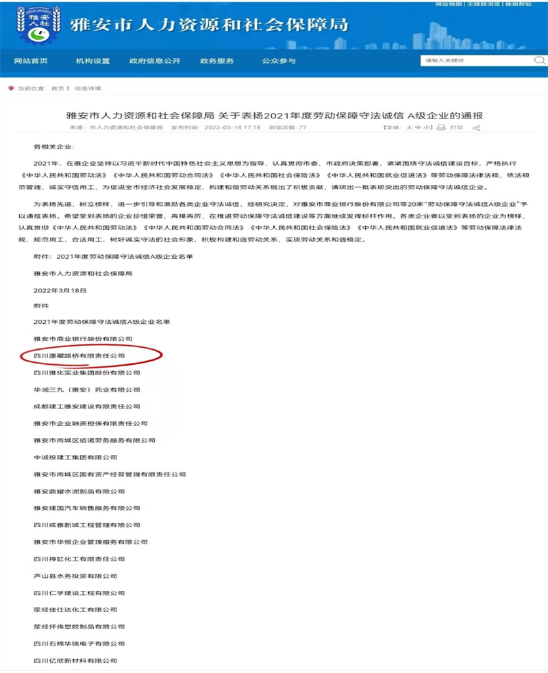 近日,根據(jù)《雅安市人力資源和社會保障局關(guān)于表揚(yáng)2021年度勞動保障守法誠信 A級企業(yè)的通報》,雅安交通建設(shè)(集團(tuán))有限責(zé)任公司下屬四川康藏路橋有限責(zé)任公司榮獲2021年度勞動保障守法誠信 A級企業(yè),名列我市“誠信紅榜”。