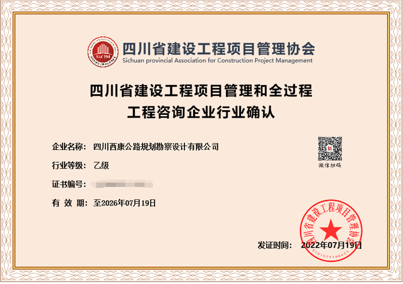 日前,經(jīng)四川省建設(shè)工程項目管理協(xié)會評審,交建集團四川西康公路規(guī)劃勘察設(shè)計有限公司獲得“四川省建設(shè)工程項目管理和全過程工程咨詢企業(yè)行業(yè)乙級資格”確認,成為四川省內(nèi)為數(shù)不多獲得開展全過程項目管理和咨詢資質(zhì)企業(yè)之一。