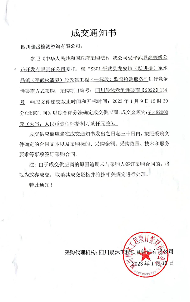 中標項目為S301平武縣龍安鎮(zhèn)(躍進橋)至水晶鎮(zhèn)(平武松潘界)段改建工程(一標段)監(jiān)督檢測服務項目,成交金額148萬余元。此次成功中標展示了公司的檢測能力和市場競爭力,為公司“走出去”積極承攬市外、省外業(yè)務增添信心。