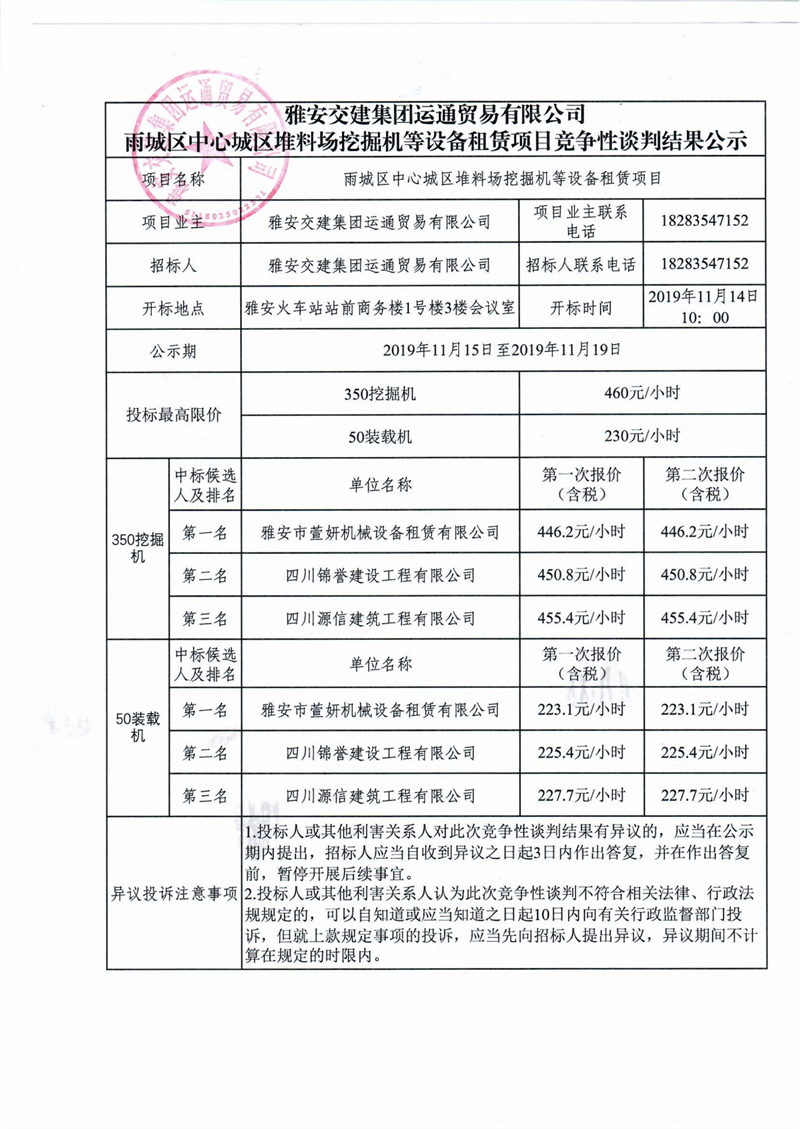 雅安交建集團運通貿(mào)易有限公司雨城區(qū)中心城區(qū)堆料場挖掘機等設(shè)備租賃項目競爭性談判結(jié)果公示
