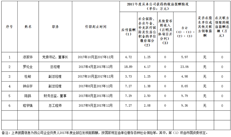 雅安市交通建設(shè)(集團(tuán))有限責(zé)任公司企業(yè)負(fù)責(zé)人2017年度薪酬情況公示表