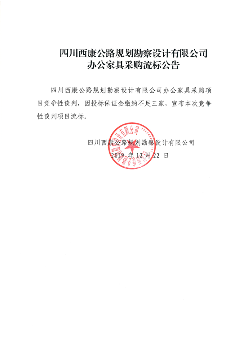 四川西康公路規(guī)劃勘察設(shè)計(jì)有限公司辦公家具采購(gòu)流標(biāo)公告