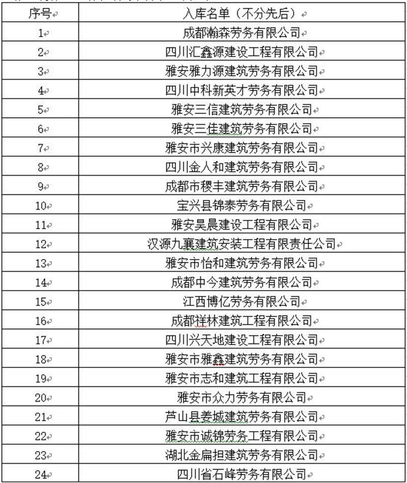 雅安交建集團(tuán)路橋有限責(zé)任公司勞務(wù)服務(wù)入庫比選項(xiàng)目于2019年5月11日完成開評標(biāo)工作,現(xiàn)將比選結(jié)果即入庫名單公示如下: