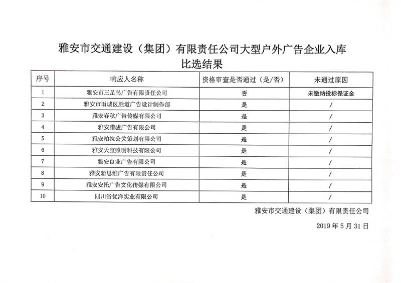 雅安市交通建設(shè)(集團(tuán))有限責(zé)任公司大型戶外廣告企業(yè)入庫比選結(jié)果