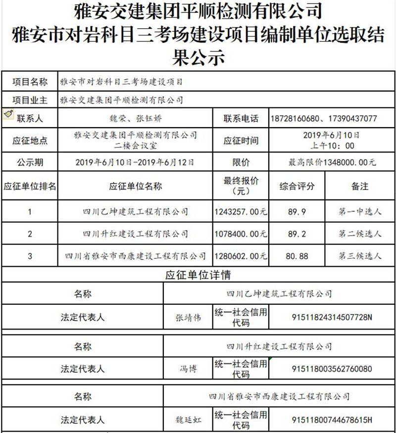 雅安交建集團(tuán)平順檢測(cè)有限公司雅安市對(duì)巖科目三考場(chǎng)建設(shè)項(xiàng)目編制單位選取結(jié)果公示
