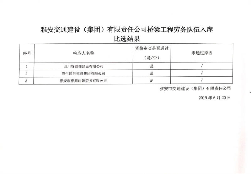 雅安交通建設(shè)(集團(tuán))有限責(zé)任公司橋梁工程勞務(wù)隊(duì)伍入庫比選結(jié)果