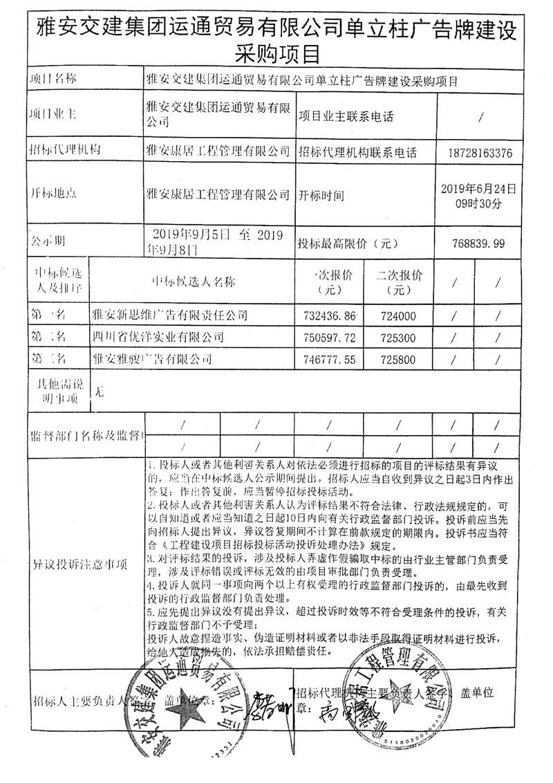 雅安交建集團(tuán)運(yùn)通貿(mào)易有限公司單立柱廣告牌建設(shè)采購項(xiàng)目競爭性談判結(jié)果公示