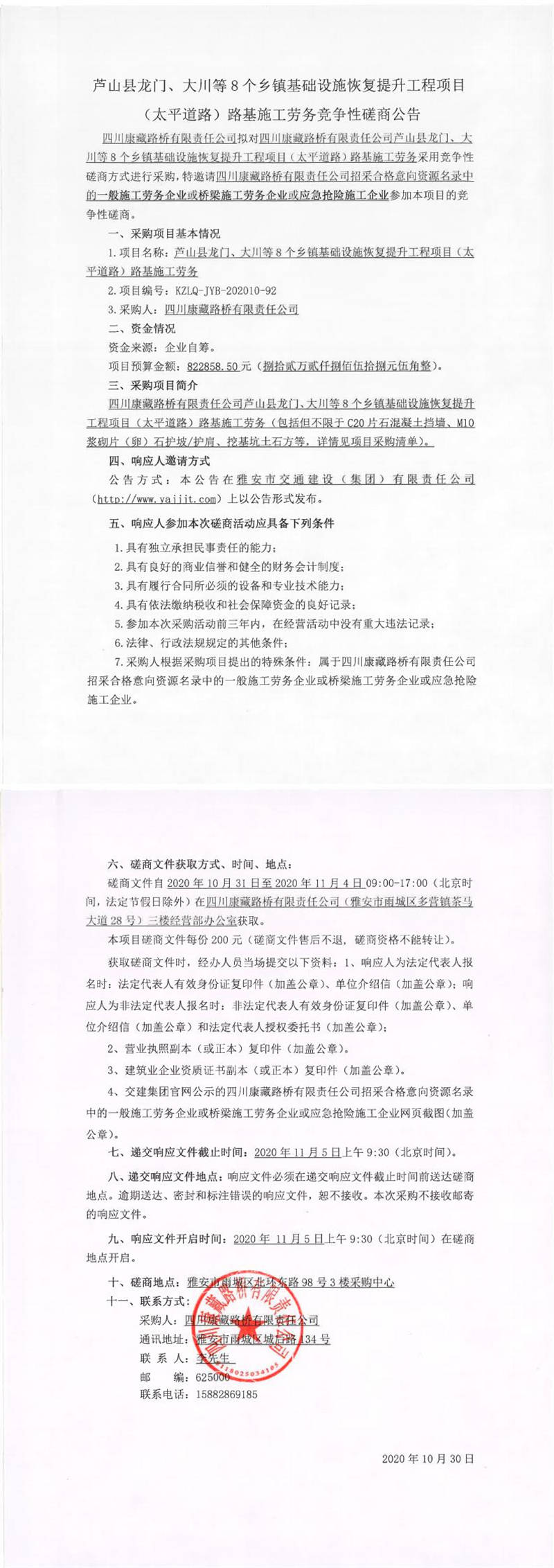 四川康藏路橋有限責任公司蘆山縣龍門、大川等8個鄉(xiāng)鎮(zhèn)基礎(chǔ)設(shè)施恢復(fù)提升工程項目(太平道路)路基施工勞務(wù)競爭性磋商公告