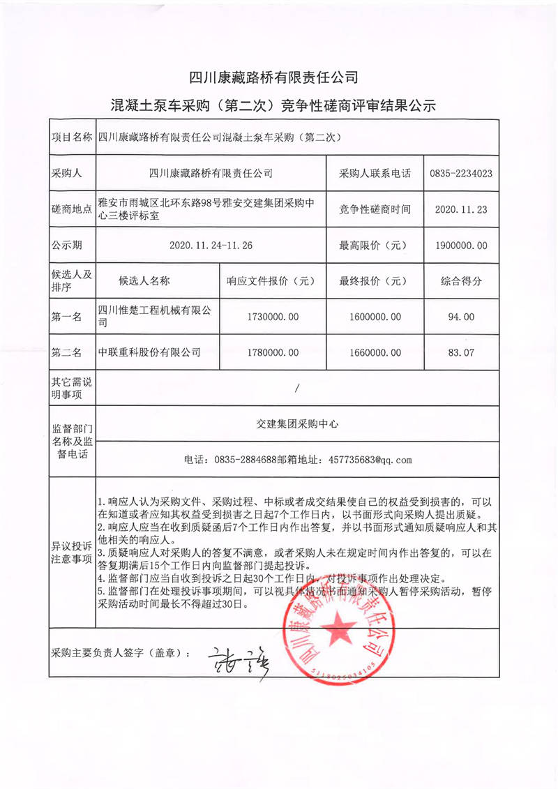 四川康藏路橋有限責任公司混凝土泵車采購(第二次)競爭性磋商評審結果公示