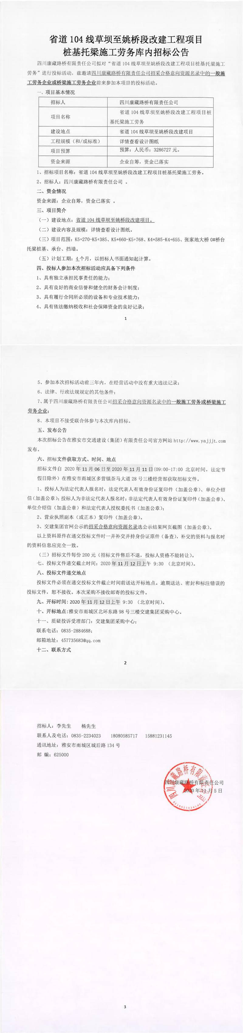 四川康藏路橋有限責(zé)任公司省道104線草壩至姚橋段改建工程項目樁基托梁施工勞務(wù)庫內(nèi)招標公告
