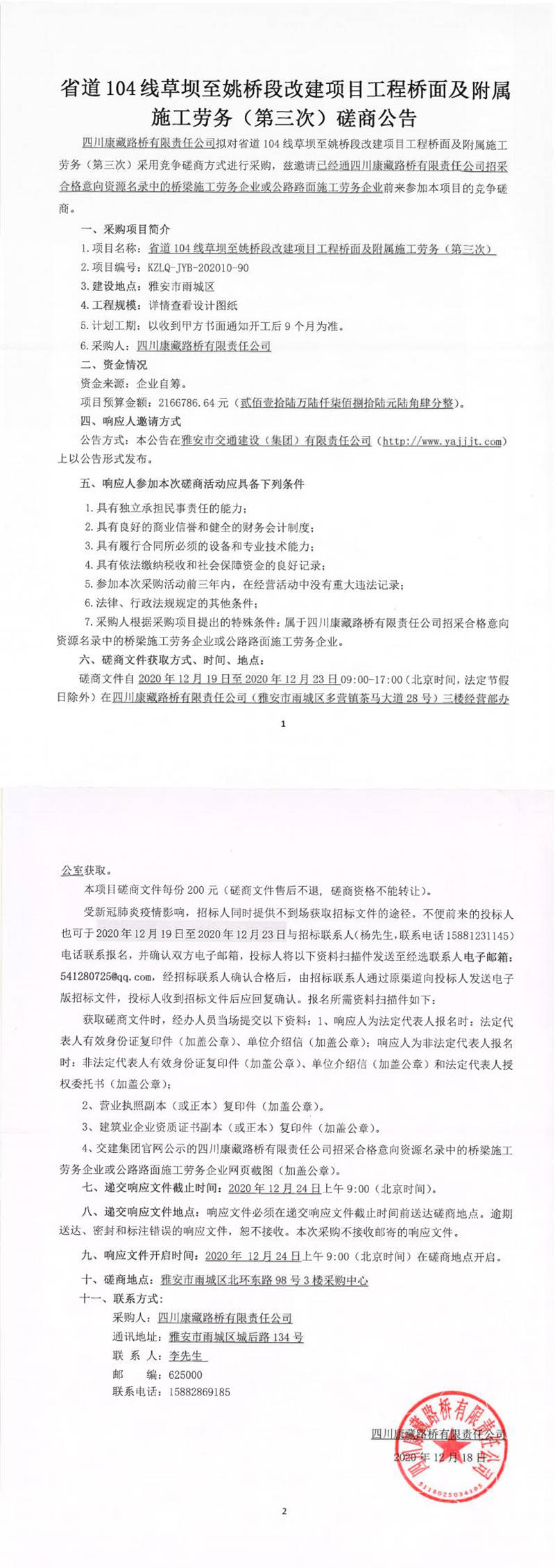 四川康藏路橋有限責(zé)任公司省道104線草壩至姚橋段改建項(xiàng)目工程橋面及附屬施工勞務(wù)(第三次)磋商公告