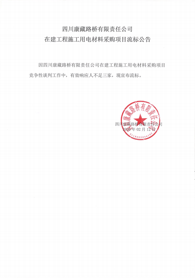 四川康藏路橋有限責(zé)任公司在建工程施工用電材料采購(gòu)項(xiàng)目流標(biāo)公告