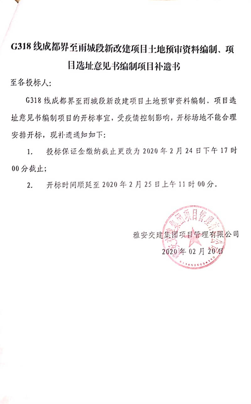 雅安交建集團項目管理有限公司G318線成都界至雨城段新改建項目土地預(yù)審資料編制、項目選址意見書編制項目補遺書