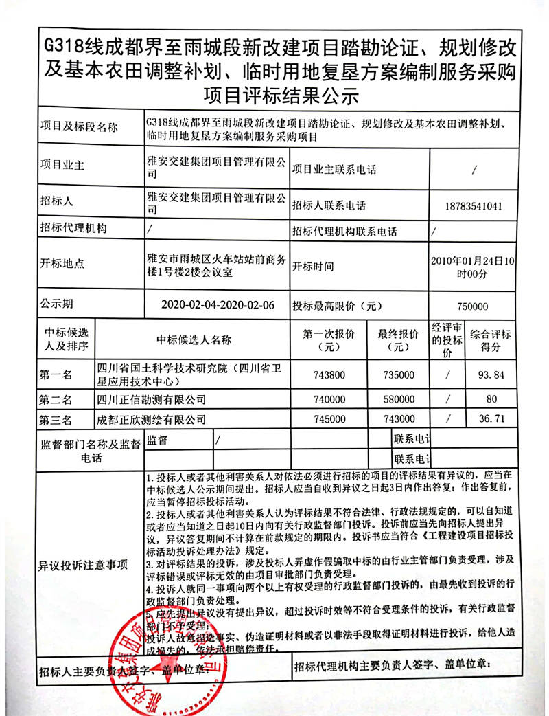 雅安交建集團(tuán)項(xiàng)目管理有限公司G318線成都界至雨城段新改建項(xiàng)目踏勘論證、規(guī)劃修改及基本農(nóng)田調(diào)整補(bǔ)劃、臨時(shí)用地復(fù)墾方案編制服務(wù)采購項(xiàng)目評標(biāo)結(jié)果公示