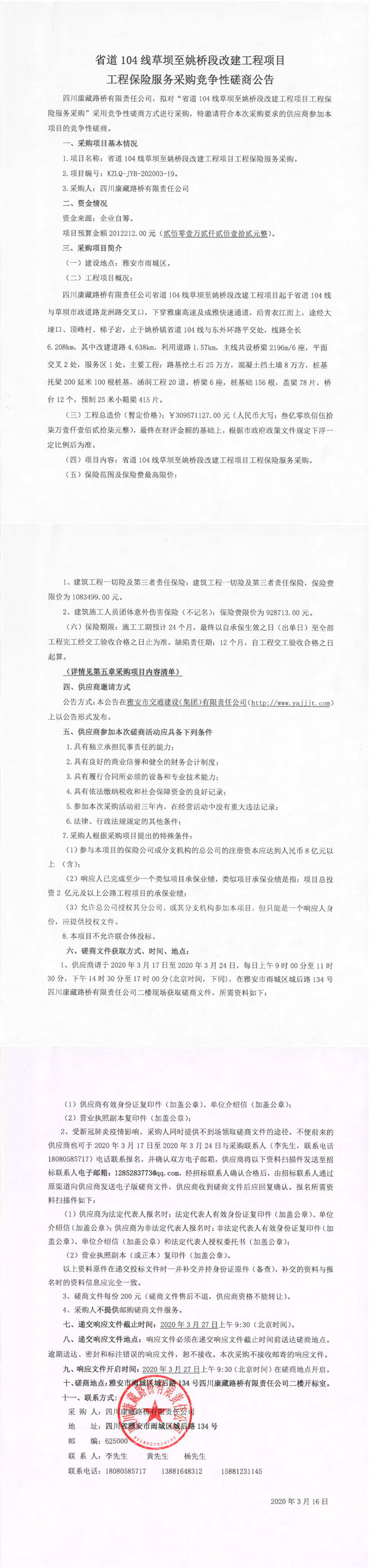 四川康藏路橋有限責(zé)任公司省道104線草壩至姚橋段改建工程項(xiàng)目工程保險(xiǎn)服務(wù)采購(gòu)競(jìng)爭(zhēng)性磋商公告