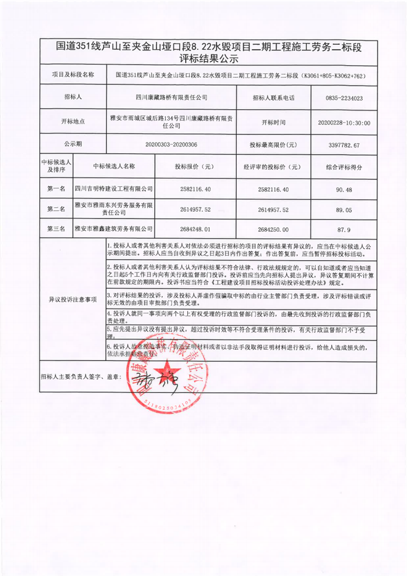 四川康藏路橋有限責任公司國道351線蘆山至夾金山埡口段8.22水毀項目二期工程施工勞務二標段評標結(jié)果公示