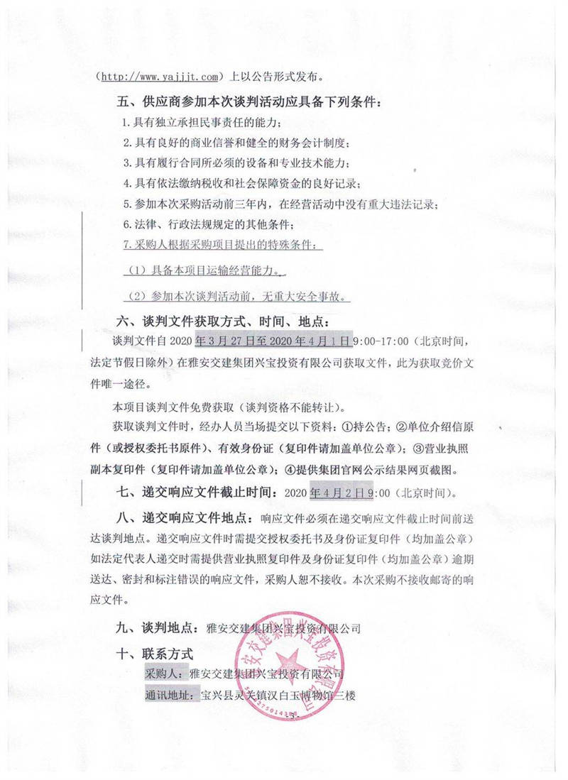 雅安交建集團(tuán)興寶投資有限公司靈關(guān)鎮(zhèn)代碑寺物流園土地整理?xiàng)壴\(yùn)輸采購項(xiàng)目競爭性談判公告