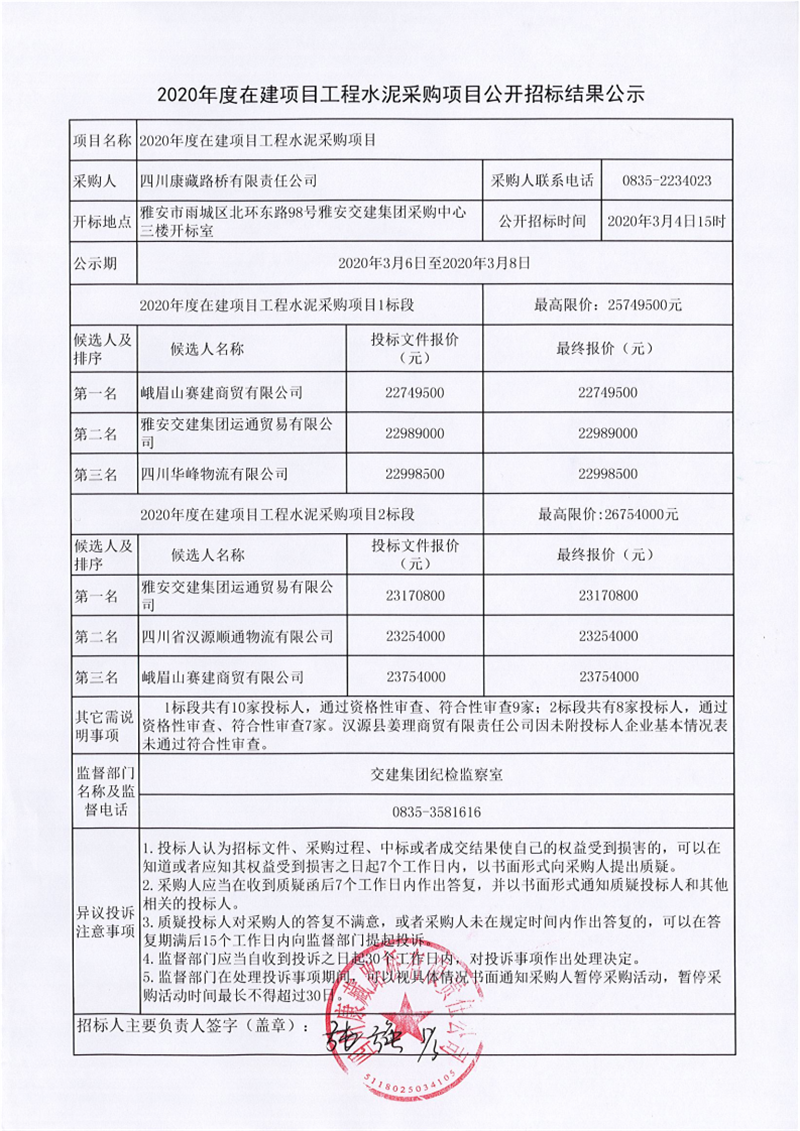 四川康藏路橋有限責(zé)任公司2020年度在建項(xiàng)目工程水泥采購項(xiàng)目公開招標(biāo)結(jié)果公示