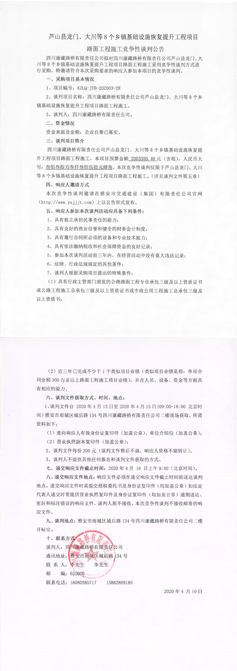 四川康藏路橋有限責任公司蘆山縣龍門、大川等8個鄉(xiāng)鎮(zhèn)基礎設施恢復提升工程項目路面工程施工競爭性談判公告