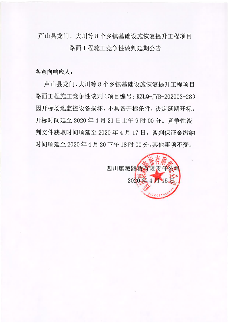 四川康藏路橋有限責任公司蘆山縣龍門、大川等8個鄉(xiāng)鎮(zhèn)基礎設施恢復提升工程項目路面工程施工競爭性談判延期公告