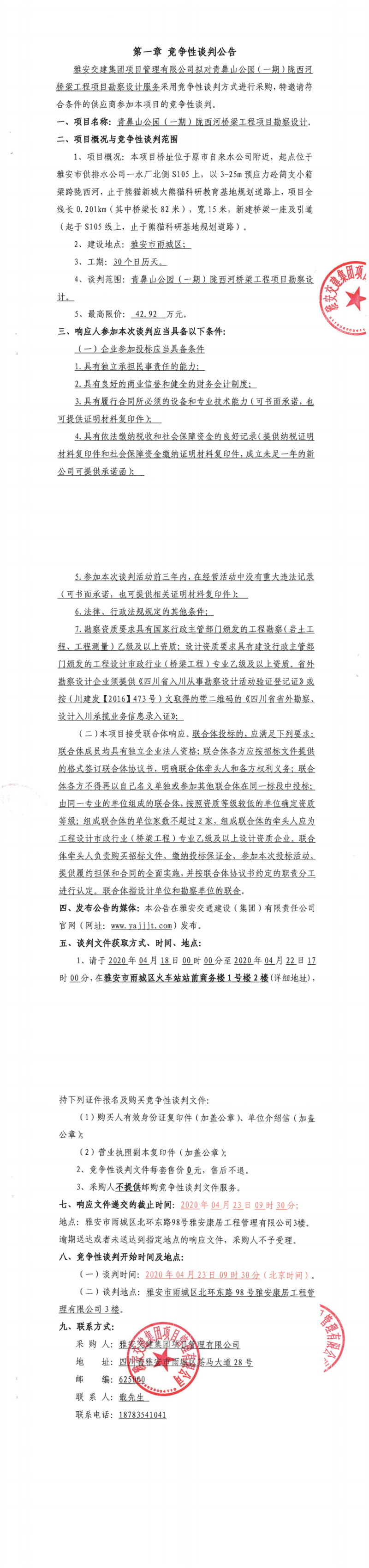 雅安交建集團(tuán)項(xiàng)目管理有限公司青鼻山公園(一期)隴西河橋梁工程項(xiàng)目勘察設(shè)計(jì)競爭性談判公告