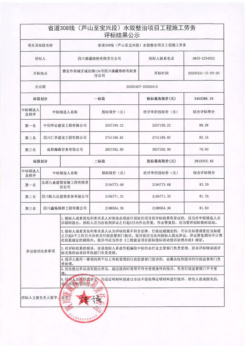 四川康藏路橋有限責任公司省道308線(蘆山至寶興段)水毀整治項目工程施工勞務評標結果公示