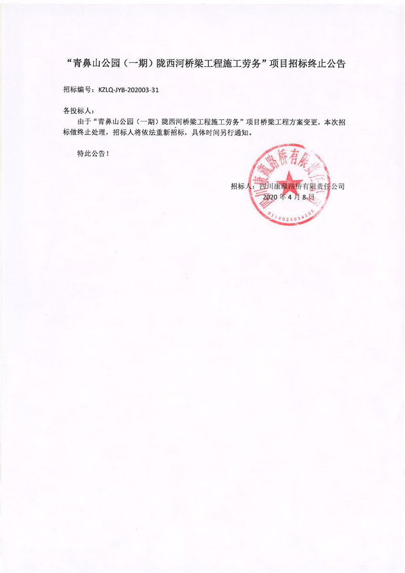 四川康藏路橋有限責任公司青鼻山公園(一期)隴西河橋梁工程施工勞務項目招標終止公告