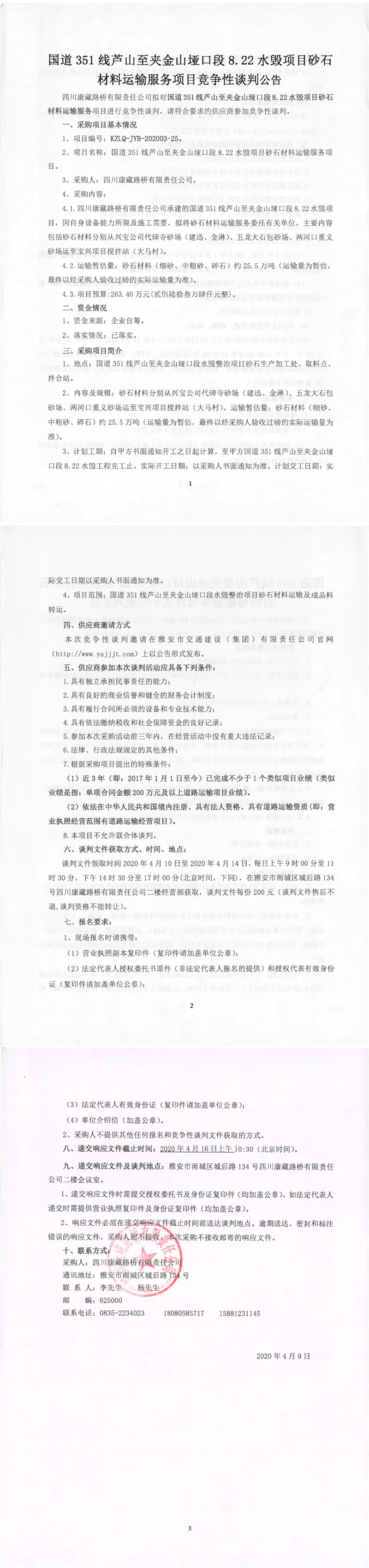 四川康藏路橋有限責(zé)任公司國道351線蘆山至夾金山埡口8.22水毀項(xiàng)目砂石材料運(yùn)輸服務(wù)項(xiàng)目競爭性談判公告