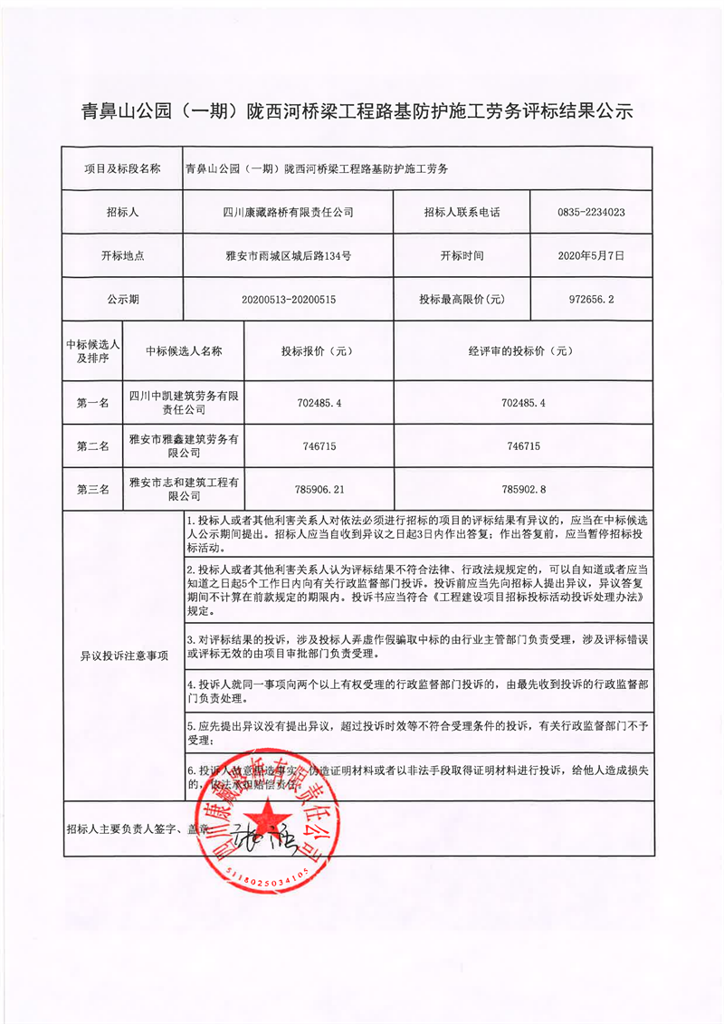 四川康藏路橋有限責(zé)任公司青鼻山公園(一期)隴西河橋梁工程路基防護(hù)施工勞務(wù)評(píng)標(biāo)結(jié)果公示