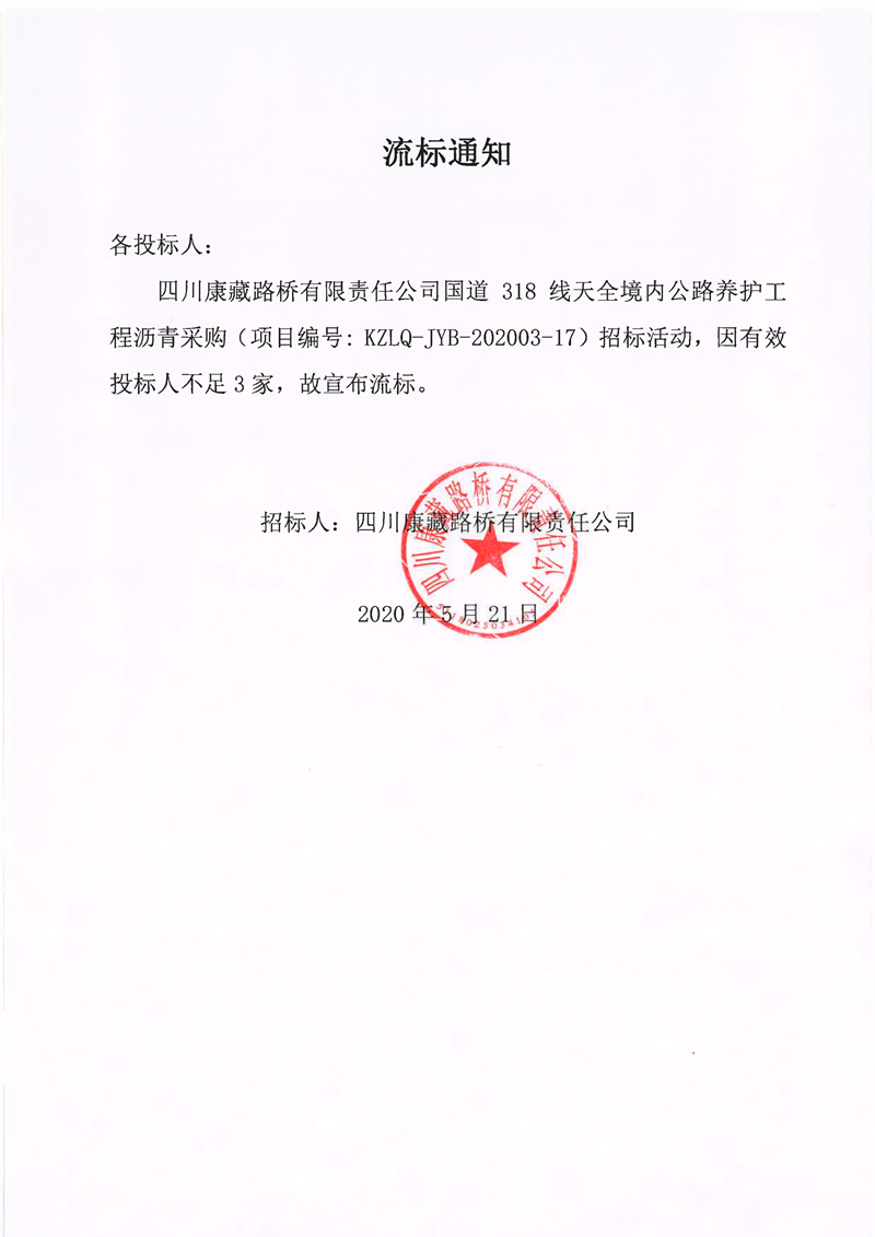 四川康藏路橋有限責任公司國道318線天全境內(nèi)公路養(yǎng)護工程瀝青采購項目流標通知