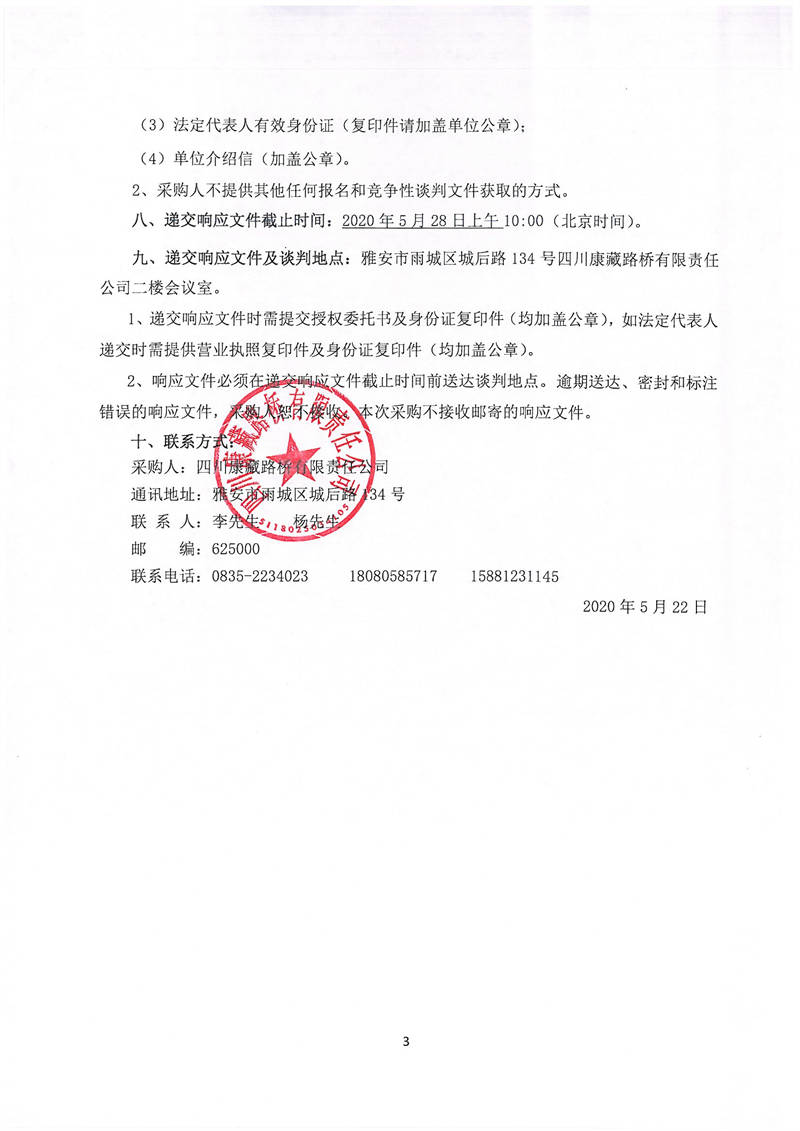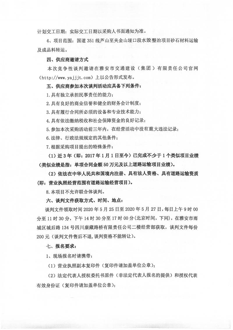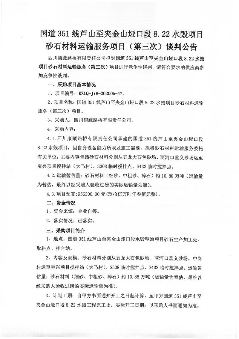 四川康藏路橋有限責任公司國道351線蘆山至夾金山埡口段8.22水毀項目砂石材料運輸服務(wù)項目(第三次)談判公告