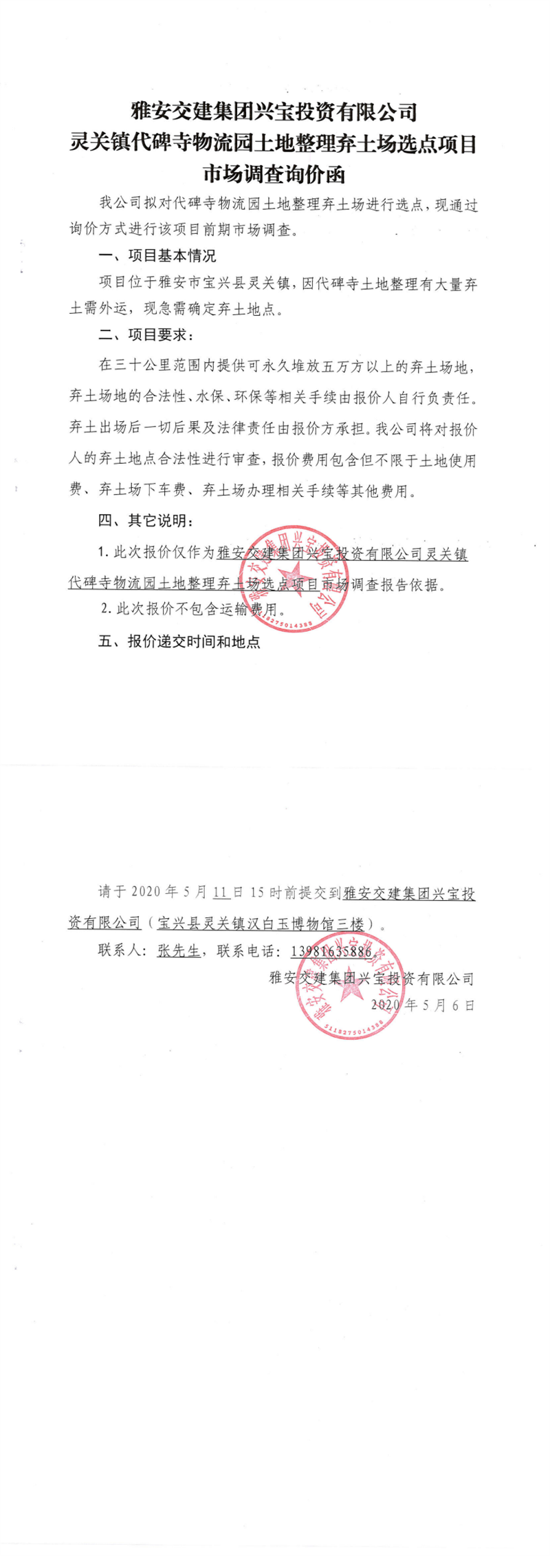 雅安交建集團(tuán)興寶投資有限公司靈關(guān)鎮(zhèn)代碑寺物流園土地整理?xiàng)壨翀?chǎng)選點(diǎn)項(xiàng)目市場(chǎng)調(diào)查詢(xún)價(jià)函