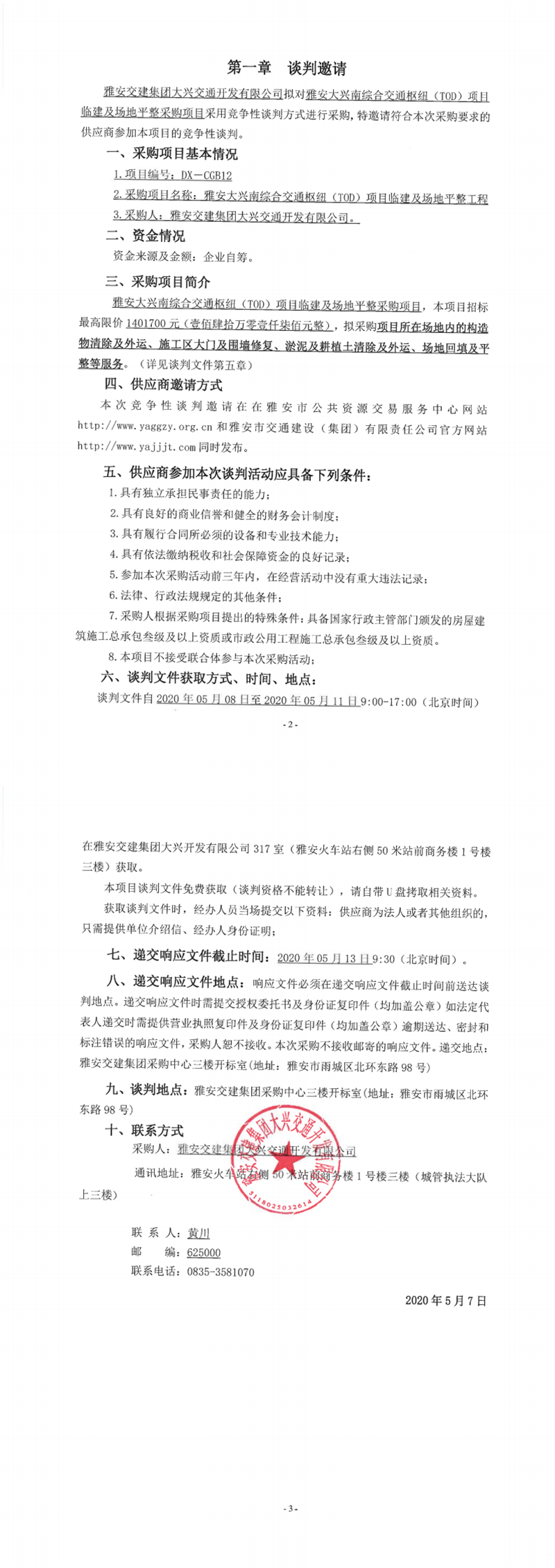 雅安交建集團(tuán)大興交通開發(fā)有限公司雅安大興南綜合交通樞紐(TOD)項目臨建及場地平整工程競爭性談判公告