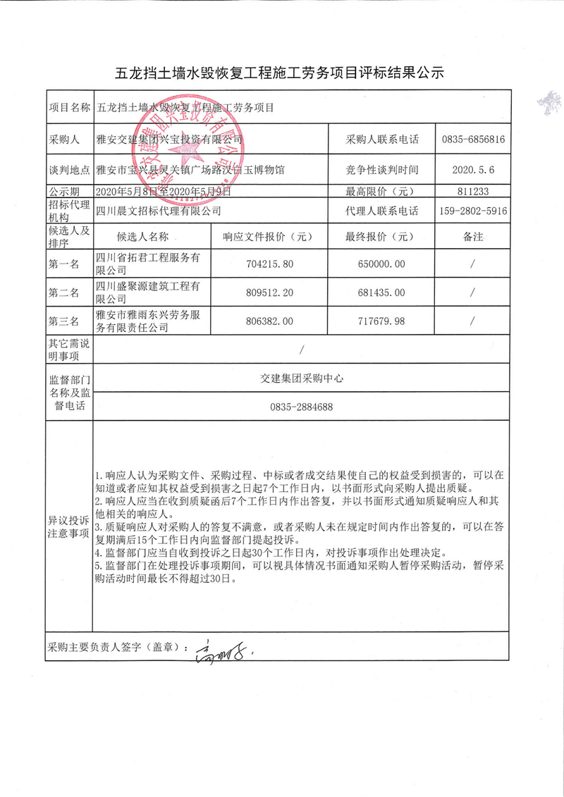 雅安交建集團興寶投資有限公司五龍擋土墻水毀恢復工程施工勞務項目評標結(jié)果公示