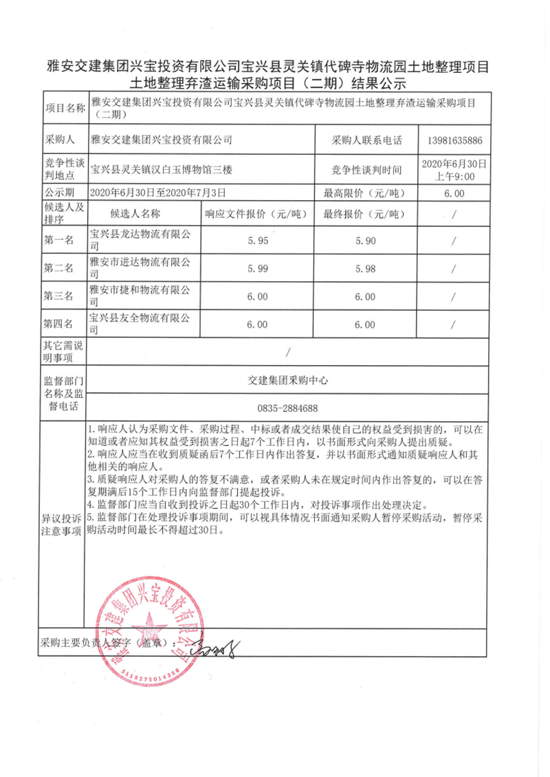 雅安交建集團(tuán)興寶投資有限公司寶興縣靈關(guān)鎮(zhèn)代碑寺物流園土地整理項(xiàng)目土地整理?xiàng)壴\(yùn)輸采購項(xiàng)目(二期)結(jié)果公示