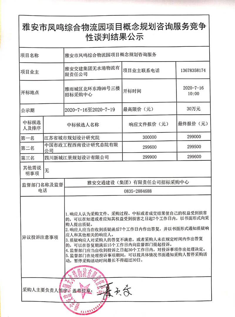 雅安交建集團(tuán)無水港物流有限責(zé)任公司雅安市鳳鳴綜合物流園項(xiàng)目概念規(guī)劃咨詢服務(wù)競爭性談判結(jié)果公示