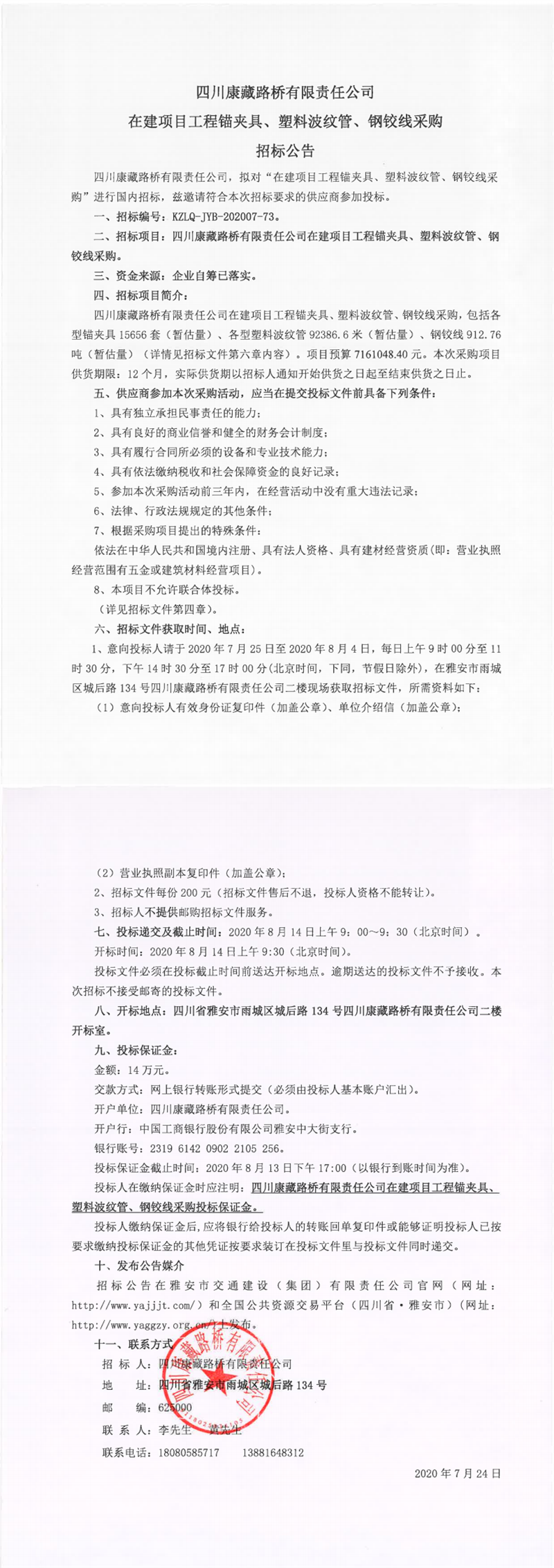四川康藏路橋有限責(zé)任公司在建項(xiàng)目工程錨夾具、塑料波紋管、鋼鉸線采購招標(biāo)公告