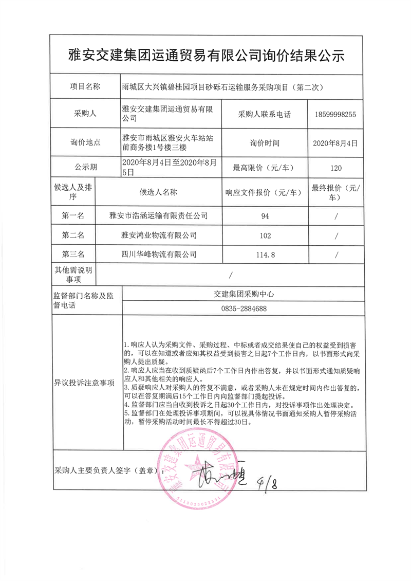 雅安交建集團(tuán)運通貿(mào)易有限公司雨城區(qū)大興鎮(zhèn)碧桂園項目砂礫石運輸服務(wù)采購項目(第二次)詢價結(jié)果公示
