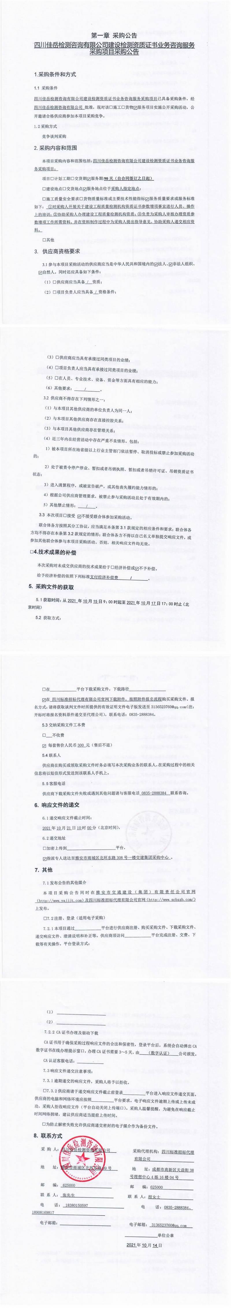 四川佳岳檢測(cè)咨詢有限公司建設(shè)檢測(cè)資質(zhì)證書業(yè)務(wù)咨詢服務(wù)采購項(xiàng)目采購公告