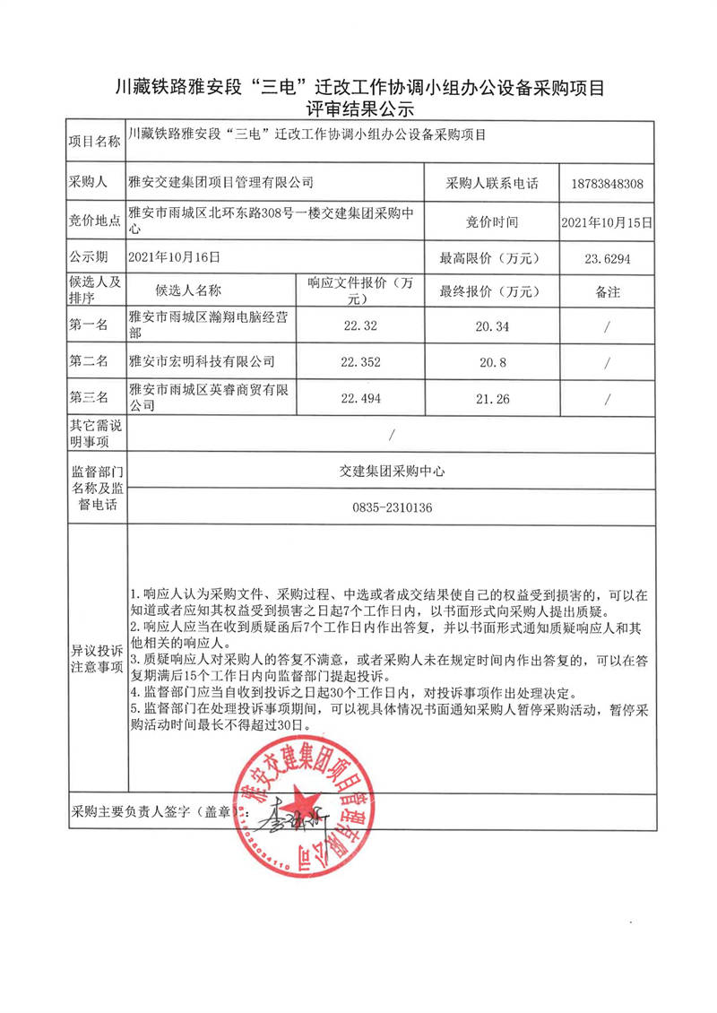 雅安交建集團(tuán)項(xiàng)目管理有限公司川藏鐵路雅安段“三電”遷改工作協(xié)調(diào)小組辦公設(shè)備采購(gòu)項(xiàng)目評(píng)審結(jié)果公示
