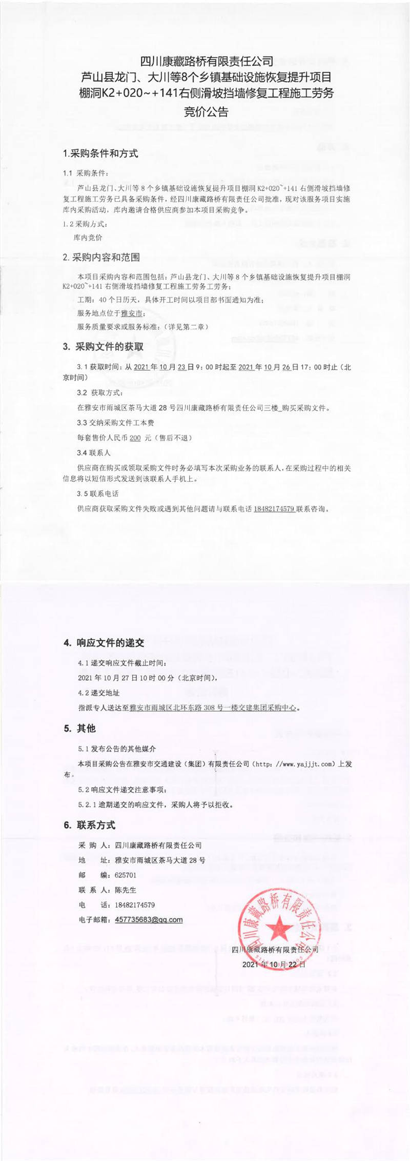 四川康藏路橋有限責任公司蘆山縣龍門、大川等8個鄉(xiāng)鎮(zhèn)基礎設施恢復提升項目棚洞K2+020~+141右側滑坡?lián)鯄π迯凸こ淌┕趧詹少徃們r公告