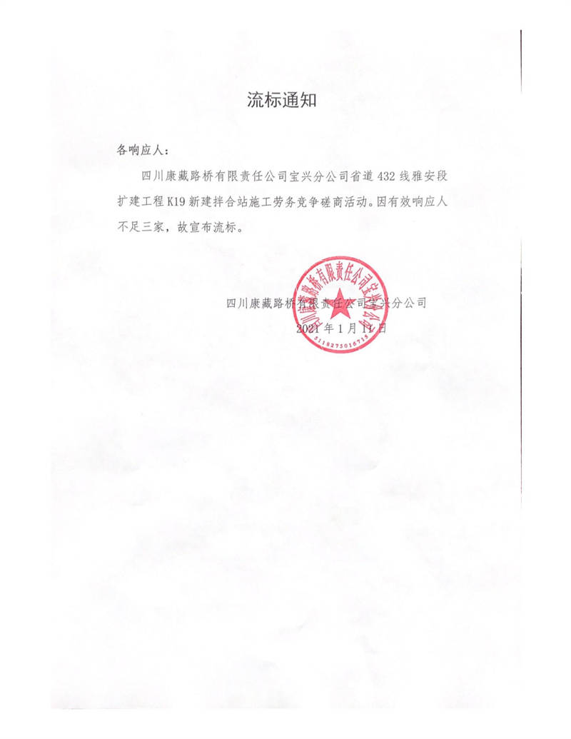 四川康藏路橋有限責(zé)任公司寶興分公司省道432線雅安段擴建工程K19新建拌合站施工勞務(wù)競爭磋商流標(biāo)通知