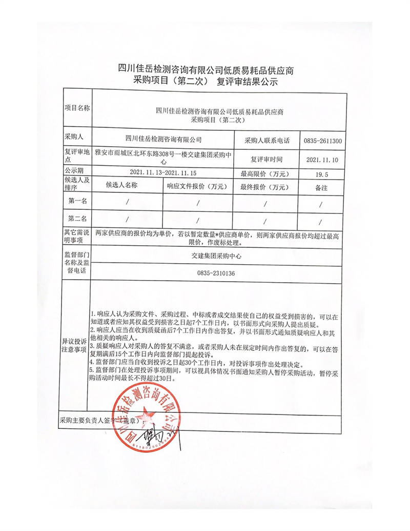 四川佳岳檢測咨詢有限公司低質易耗品供應商采購項目(第二次)復評審結果公示