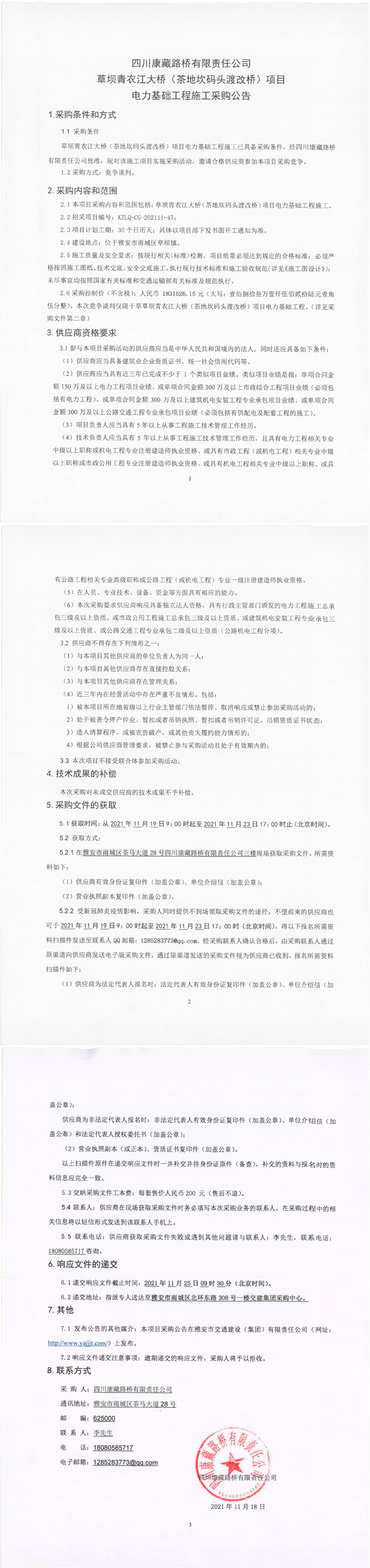 四川康藏路橋有限責任公司草壩青衣江大橋(茶地坎碼頭渡改橋)項目電力基礎工程施工采購公告