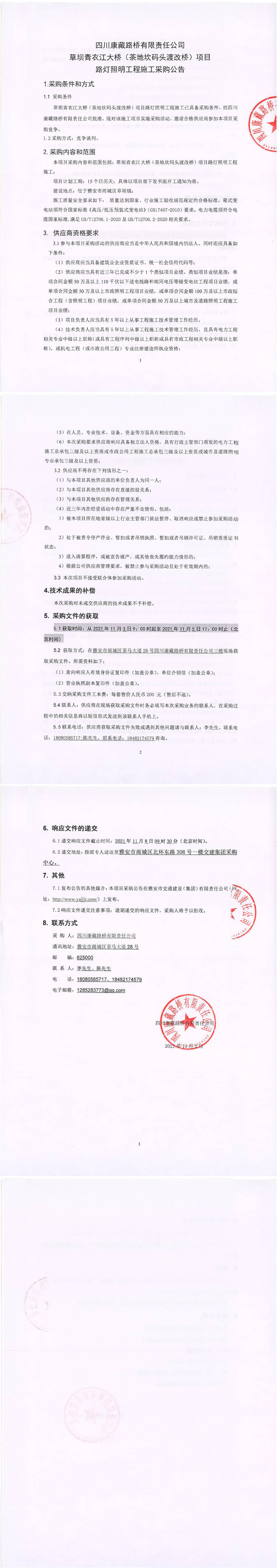 四川康藏路橋有限責(zé)任公司草壩青衣江大橋(茶地坎碼頭渡改橋)項(xiàng)目路燈照明工程施工采購(gòu)公告