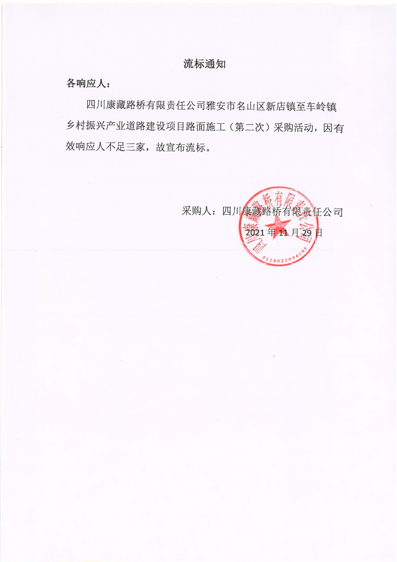四川康藏路橋有限責任公司雅安市名山區(qū)新店鎮(zhèn)至車嶺鎮(zhèn)鄉(xiāng)村振興產(chǎn)業(yè)道路建設(shè)項目路面施工(第二次)流標通知