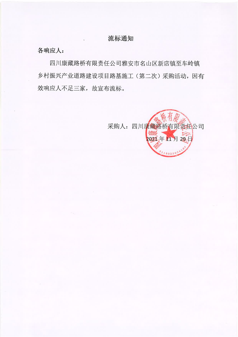 四川康藏路橋有限責(zé)任公司雅安市名山區(qū)新店鎮(zhèn)至車嶺鎮(zhèn)鄉(xiāng)村振興產(chǎn)業(yè)道路建設(shè)項目路基施工(第二次)流標通知