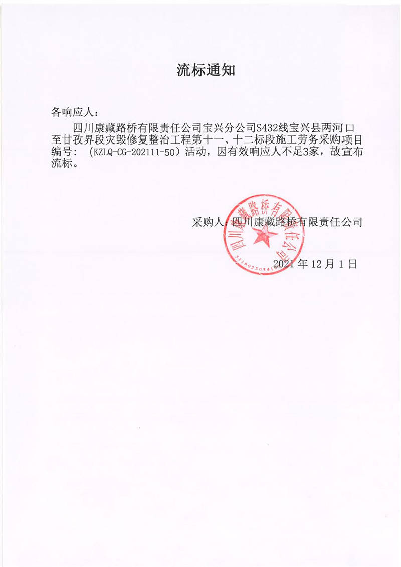 四川康藏路橋有限責(zé)任公司S432線寶興縣兩河口至甘孜界段災(zāi)毀修復(fù)整治工程第十一、十二標段施工勞務(wù)采購流標通知