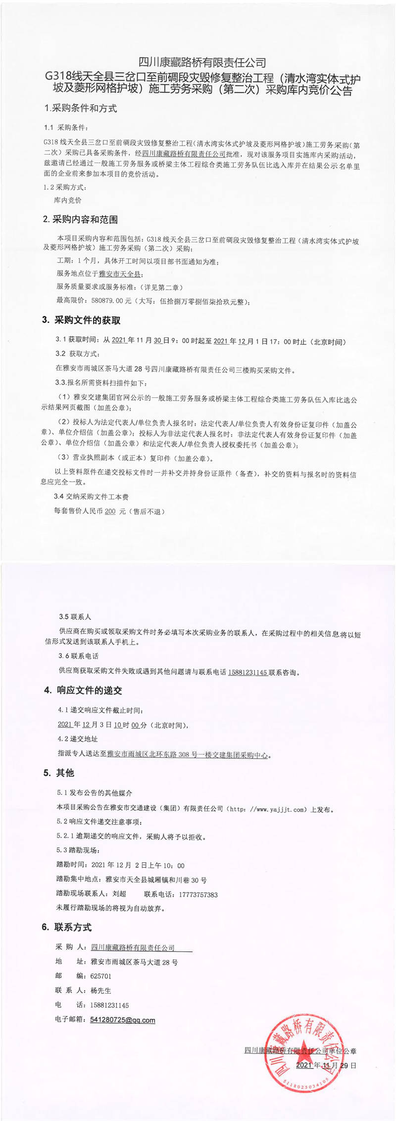 四川康藏路橋有限責(zé)任公司G318線天全縣三岔口至前碉段災(zāi)毀修復(fù)整治工程(清水灣實(shí)體式護(hù)坡及菱形網(wǎng)格護(hù)坡)施工勞務(wù)采購(第二次)采購庫內(nèi)競價公告